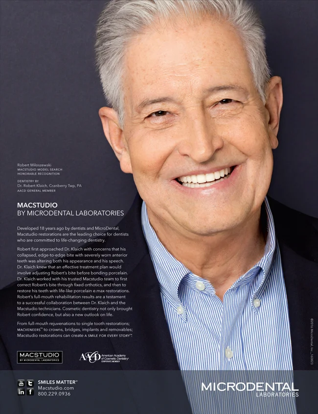 Fresh from the Journal of Cosmetic Dentistry! New Macstudio Ad featuring Robert’s charming and confident smile. At MicroDental Laboratories, we love being a part of empowering smile stories like this. Dentistry by Dr. Robert Klaich, Cranberry Twp, PA, www.cranberrydentalcare.com.